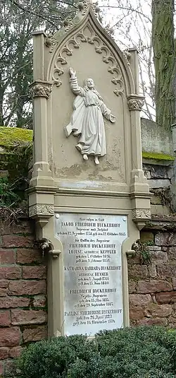 Jacob Friedrich Dyckerhoff war verheiratet mit Katharina geb. Renner. Seine Tochter Maria Katharina war verheiratet mit August Lamey. Er entwarf öffentliche und private Bauten wie das Bassermannsche Haus (R1) und das Lameysche Haus in Mannheim R7. Er beseitigte Wälle und führte die Rheinkorrektion weiter. Außerdem betätigte er sich als Maler und war an den Anfängen der Fotografie interessiert. Er ging 1815 als Hofarchitekt nach Karlsruhe.[3] Sein Grab besteht aus einer neugotischen Sandsteinstele mit eingelassener Marmorschriftplatte. Das Marmorrelief zeigt den auferstehenden Christus.