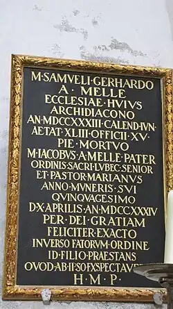 Jacob von Melle hatte bereits 1707 für sich und seine Familie eine Grabkapelle in der Burgkirche (Maria-Magdalenen-Kirche (Lübeck)) erworben,[2] in der er auch beigesetzt wurde. In der Marienkirche erinnerte ein 1942 zerstörtes Epitaph im nördlichen Chorumgang, an der Ostseite des dritten nördlichen Chorpfeilers, an ihn. Es wird beschrieben als ein „hölzernes Denkmal von mäßiger Größe“. Vor einer mit einem purpurfarbigen Wappenmantel behangenen stelenartigen Rückwand war das von Jürgen Matthias von der Hude gemalte Brustbild angebracht, über welchem ein Engel mit dem Sinnbild der Ewigkeit schwebte, während daneben eine trauernde weibliche Figur mit gesenkter Fackel stand. Auf der Basis waren Embleme der Wissenschaft aufgebaut, darunter ein Globus, die die gelehrte Tätigkeit von Melles symbolisierten. Eine herabhängende geöffnete Schriftrolle war mit Namen und Todesdatum versehen. Den unteren Abschluss bildete sein Wappen.[3]