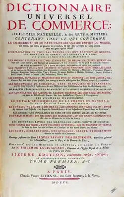 Das Dictionnaire universel de commerce wurde später von Malachy Postlethwayt ins Englische übersetzt und erweitert.[2]