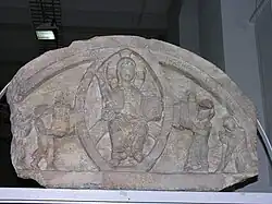 Unter dieser Szene befindet sich in der zweigeteilten Sandsteinplatte die dreizeilige Inschrift: