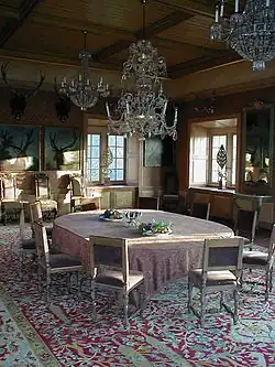 Im Obergeschoss werden die höfischen Repräsentationsräume in ihrer barocken Pracht gezeigt. In den Fluren beeindrucken besonders die Trophäen, vor allem die auf hölzerne Hirschköpfe montierten Geweihe erlegter Hirsche, wobei auch manche Kuriosität dabei ist. Jagdgemälde, Tapisserien sowie jagdliche Accessoires vermitteln die Atmosphäre eines barocken Lustschlosses.