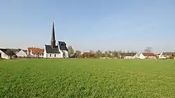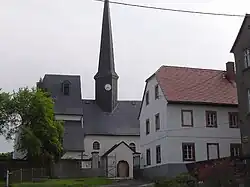 Direkt an der Ortsdurchfahrt liegt die Dorfkirche, die sowohl romanische als auch gotische Stilmerkmale aufweist. Unmittelbar neben dem Kirchgelände steht das zukünftige Dorfgemeinschaftshaus, in dem sich bis 1996 der Kindergarten und in den 1990er Jahren auch die Gemeindeverwaltung befand. Ebenfalls in diesem Teil des Dorfes liegt das unter den Dorfbewohnern sogenannte „Dreieck“, welches im Grunde nur ein Rasenstück in ebendieser Form ist. Darauf steht ein Steinkreuz, ein Denkmal, da einer Sage nach an diesem Ort während einer Hungersnot eine Frau eine andere wegen eines Ziegenkäses umgebracht haben soll. Am Dreieck steht ebenfalls der ehemalige Gasthof, der bis Anfang der 1990er Jahre in Betrieb war.