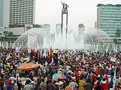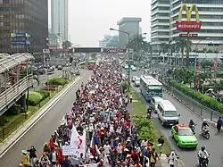 Vom 12. bis 14. Mai 1998 kam es in Jakarta und im ganzen Land zu den schwersten Unruhen seit dem angeblichen kommunistischen Putschversuch im Jahre 1965, sie stürzten das Land zum Teil in Chaos und Anarchie. Angehörige der Spezialeinheit Kopassus entführten und töteten mehrere Anhänger der Demokratiebewegung in der Stadt und lösten somit die Unruhen aus. Zehntausende Menschen zogen plündernd durch die Straßen, zumal im Viertel Glodok, in dem vor allem Indonesier chinesischer Herkunft wohnen.[18] Sie zündeten Häuser und Autos an, zahlreiche chinesische Frauen wurden vergewaltigt. Das „Volunteers Team for Humanity“ dokumentierte 152 Vergewaltigungen und sexuelle Übergriffe, 20 der Opfer starben. Nach Angaben der offiziellen Staatskommission für Menschenrechte Komnas HAM forderten die Unruhen in Jakarta 1.188 Menschenleben und 101 Verletzte. Nur ein kleiner Teil der Opfer gehörte zur chinesischen Minderheit. Die meisten Toten waren Plünderer, die in den brennenden Gebäuden eingeschlossen wurden. Am 21. Mai 1998 trat Suharto als Präsident des Landes zurück.[19]