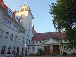 1938 wurde die Kirche um ein Gemeindehaus mit drei großen Wohnungen im Dachgeschoss und um einen Kirchturm mit vier Glocken erweitert. Heute sind drei Glocken aus Eisenhartguss erhalten, die 1928 von der Gießerei Schilling und Lattermann in Apolda gegossen wurden und in den Tönen ges, as und es' klingen.