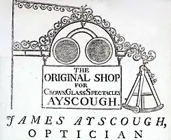 - ↑ Trade card: Advertisement. At James Ayscough (1751)