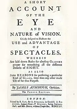 - James Ayscough: A Short Account Of The Eye And Nature Of Vision: Chiefly Designed To Illustrate The Use And Advantage Of Spectacles. 2. Auflage 1752 (Erweiterung der Ausgabe von 1750), 3. Auflage 1754, 4. Auflage 1755, 26 nummerierte Seiten plus 2 Werbeseiten[5]