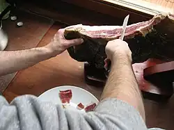 Das dazugehörige spezielle, sehr scharfe und mit einer langen, flexiblen Klinge ausgestattete Messer nennt sich Cuchillo jamonero (deutsch Schinkenmesser).