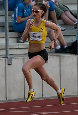 Die Mittelstreckenläuferin war 2007 Deutsche Hallenmeisterin über 800 Meter. Im selben Jahr nahm sie auch an den Halleneuropameisterschaften in Birmingham teil. 2008 wurde sie in Nürnberg über die 800 Meter Deutsche Meisterin. In diesem Rennen fiel die Zeitmessanlage aus und es war das erste Rennen bei Deutschen Meisterschaften ohne Siegerzeit. Bei der Team-Europameisterschaft 2009 im portugiesischen Leiria stellte Hartmann mit 2:00,71 min ihre persönliche Bestleistung auf und gewann mit der deutschen Mannschaft den Titel. Im selben Jahr nahm sie an den Weltmeisterschaften in Berlin teil. 2010 und 2011 wurde sie sowohl in der Halle als auch im Freien Deutsche Meisterin. Bei den Halleneuropameisterschaften 2011 in Paris schied sie im Halbfinale aus. In der Freiluftsaison erreichte sie bei der Team-Europameisterschaft in Stockholm mit der deutschen Mannschaft den zweiten Platz. 2013 beendete sie ihre Leistungssportkarriere bei den Deutschen Hallenmeisterschaften in ihrer Wahlheimat Dortmund.[1]