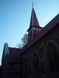 Die Kirche, die sich am südlichen Ortsausgang auf der östlichen Straßenseite befindet, wurde am 3. Januar 1892 nach fünfjähriger Bauzeit als evangelisches Gotteshaus eingeweiht. Es handelt sich um einen massiven Feldstein- und Ziegelbau mit spitzem Turm. Die Innenausstattung war in romanischem Stil gehalten.