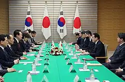 Die bilateralen Beziehungen der beiden Länder verschlechterten sich Ende 2018, nachdem der Oberste Gerichtshof Südkoreas das Urteil traf, in der mehrere japanische Unternehmen, darunter Mitsubishi Heavy Industries und Nippon Steel, dazu verurteilt wurden, die Familien von Zwangsarbeitern während des Zweiten Weltkriegs zu entschädigen was die Japanische Regierung ablehnte.[20] Der Disput führte zu einem Handelskrieg zwischen beiden Ländern und Demonstrationen in Südkorea.[21]