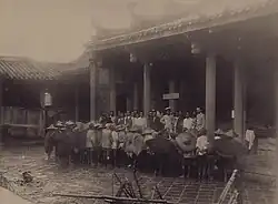 Im März 1895, während des japanisch-chinesischen Krieges, eroberte Japan die Penghu-Inseln, die ca. 50 Kilometer vor der Westküste Taiwans liegen. Diese Aktion der Japaner versetzte die Obrigkeiten in Formosa in hohe Alarmbereitschaft. Rasch wurden Geld und Ausrüstung vom chinesischen Festland auf die Insel gebracht, da man damit rechnete, dass Japan Formosa als Nächstes angreifen würde.[7] Viele Bewohner der Insel wurden zum Kriegsdienst aufgeboten.[8] Es wurden auch Rekrutierungsbüros eröffnet, in denen sich jeder Bewohner freiwillig für die Armee melden konnte.[9] Der Großteil der regulären Truppen der Republik bestand jedoch nicht aus Taiwanern, sondern aus Soldaten vom chinesischen Festland, zumeist aus Guangdong, da es die Politik der bisherigen Qing-Regierung gewesen war, die Armee auf Taiwan nicht aus Taiwanern zu rekrutieren, um Aufständen gegen die Qing-Herrschaft vorzubeugen. Diese Truppen verfügten über keine lokale Bindung zu Taiwan, was sich in einer äußerst niedrigen Kampfmoral in den anstehenden Gefechten mit den Japanern niederschlagen sollte.[10][11] Mitglieder dieser zusammengewürfelten Truppe, in der Wenige eine militärische Ausbildung hatten, begannen bald, die Städte unsicher zu machen. Die „Soldaten“ verboten eigenhändig die Ausreise von der Insel und zettelten Schießereien in den Straßen von Taipeh an. Die Situation wurde so angespannt, dass Großbritannien, das Deutsche Reich und die Vereinigten Staaten Kriegsschiffe und Truppen entsandten, um ihre Konsulate und Handelsinteressen auf Formosa zu schützen.[12] Als Reaktion auf die formelle Übergabe Taiwans durch China an Japan Mitte April 1895 riefen Mitglieder der bisherigen Provinzregierung und Angehörige der taiwanischen Oberschicht am 25. Mai 1895 in Taipeh die Republik Formosa aus. Dies erkannte Japan nicht an und begann einige Tage später mit der Invasion der Insel Taiwan.[13]
