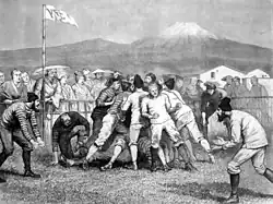 Wie zahlreiche andere westliche Gewohnheiten gelangte auch der Rugbysport nach Japan, nachdem die Kanonenbootpolitik der Vereinigten Staaten und der europäischen Mächte 1854 die selbstauferlegte Isolation des Landes beendet hatte. Der erste Rugbyverein war der 1866 gegründete Yokohama Foot Ball Club.[13] Die Regelkommission bestand aus Absolventen der Rugby School, des Radley College und des Winchester College. Hauptsächlich spielten die Besatzungen verschiedener in Yokohama vor Anker liegender Schiffe gegeneinander, wofür sie das Gelände der britischen Garnison im Stadtteil Yamate nutzten.[14] Das erste offiziell aufgezeichnete Spiel fand 1874 statt. In anderen Vertragshäfen wie Kōbe fanden ebenfalls Rugbyspiele zwischen länger verweilenden ausländischen Bewohnern sowie besuchenden Seeleuten und Garnisonen statt, jedoch selten mit japanischer Beteiligung.[15]