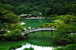 - Takamatsu: Ritsurin-Park, ein weitläufiger Wandelgarten, der Hügel im Hintergrund als „geborgte Landschaft“ (借景, shakkei) einbezieht.