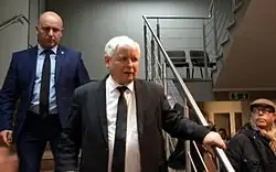 Nachdem die PiS bei der Parlamentswahl im Jahr 2023 wieder Oppositionspartei geworden war, fiel Kaczyński, der erneut ein Mandat errungen hatte,[53] mit nicht haltbaren Äußerungen auf. So erklärte er, dass das polnische Parlament nicht mehr existiere, der Regierungschef Donald Tusk, den er mit Adolf Hitler verglich, ein „deutscher Agent“ sei und dass zwei wegen Amtsmissbrauchs verurteilte PiS-Politiker (Mariusz Kamiński und dessen Staatssekretär Maciej Wąsik) gefoltert worden seien. Letzteres wurde von der zuständigen Ärztekammer bestritten. Infolge dieser Äußerungen Kaczyńskis wurde er vom in rechtskonservativen Kreisen angesehenen Historiker Andrzej Nowak zum Rücktritt als Parteichef aufgefordert.[54] Am 6. März 2025 hob der Sejm mit 236 zu 200 Stimmen Kaczyńskis Immunität auf. Hintergrund war seine Aussage vor dem Pegasus-Untersuchungsausschuss.[55]