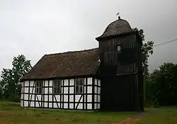 Die evangelische Gutskirche zu Jassen ist erst nach Einführung der Reformation in Pommern erbaut worden[19]; im Jahr 1584 ließ sie Hans von Wussow als Begräbniskapelle errichten. Die Kirchenglocke von 1678 wurde der Kirchenchronik von Groß Pomeiske zufolge von ‚Hans Juergen Wussow‘ gestiftet. 1699 wurde von Nikolaus Lorenz von Wussow ein Neubau in der heutigen Form angelegt[20]; es handelt sich dabei um einen dreiseitig geschlossenen Fachwerkbau mit kleinem Südturm, dem eine Wetterfahne aufgesetzt wurde. Um 1810 wurde das baufällig gewordene Gebäude erneuert, bei gleichzeitiger Erweiterung durch einen Anbau an der Südseite. Im Zeitraum 1847–1851 wurden gründliche Renovierungsarbeiten durchgeführt, und das bisherige Schindeldach wurde durch ein Ziegeldach ersetzt. 1923 wurden die Dachbedeckungen nochmals ausgewechselt, und zwar erhielt das Kirchenschiff nun ein Strohdach, und das Kirchturm-Dach wurde mit Biberschwänzen abgedeckt. Im Jahr 1925 war die Kirche erneut renovierungsbedürftig; es wurde die Firma Hoffmann, Finkenwalde, mit der Wiederherstellung des Kirchengebäudes und seiner Innenausstattung beauftragt.[16]