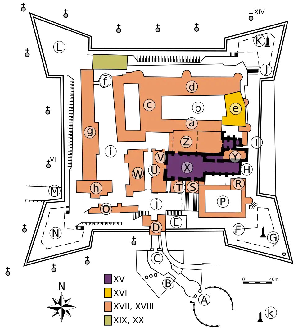 Die Festung erstreckt sich auf einem ca. 5 Hektar großen Areal. Der befestigte Teil der Anlage – vom 15. Jahrhundert (im Bild violett) bis zum 20. Jahrhundert errichtet – ist im Norden, Westen und Südwesten von einem Park umgeben.
