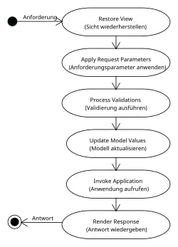Die Spezifikation der Jakarta Server Faces definiert einen sogenannten Lebenszyklus, den eine JSF-Anwendung mit jedem Aufruf erneut durchläuft. Dieser Lebenszyklus ist in sechs Phasen aufgeteilt.