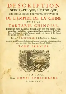 Jean-Baptiste Du Halde (* 1. Februar 1674 in Paris; † 18. August 1743 ebenda) war ein französischer Jesuit, Geograph und Sinologe, der insbesondere durch das 1735 veröffentlichte, vierbändige Werk Description de la Chine et de la Tartarie chinoise (Beschreibung Chinas und der chinesischen Tartarei) bekannt wurde.[1]