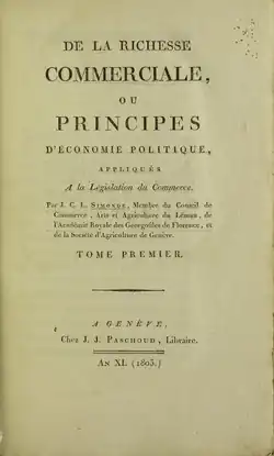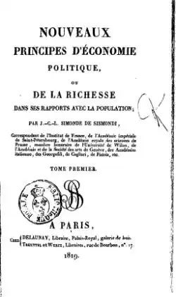 Sismondi hat seinen Ruf als Wirtschaftswissenschaftler durch sein Werk Nouveaux principes d’économie politique, ou de la richesse dans ses rapports avec la population begründet, das 1819 erschienen ist, zwei Jahre nach dem Hauptwerk David Ricardos. Die wesentlichsten Gedanken desselben wurden schon 1815 für einen Artikel in Brewsters Edinburgh Encyclopaedia niedergeschrieben, der aber erst hernach veröffentlicht wurde. In den Études sur l’économie politique hat Sismondi seine Hauptthesen weiter ausgebaut.[16]