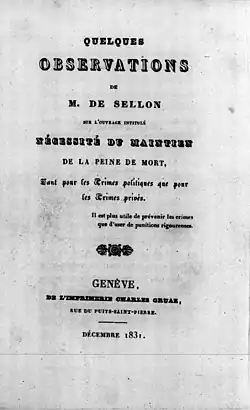 - Jean-Jacques Sellon: Lettre de l’auteur du concours ouvert à Genève en 1826 en faveur de l’abolition de la peine de mort à l’un de ses honorables collègues du conseil souverain. Lador, Genève 1827.