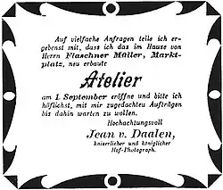 1894 zog Jean van Daalen nach Aalen um. Dort übernahm er die Atelierräume, die ursprünglich von dem Fotografen C. Burghardt erbaut und dann zeitweise von Wilhelm Boppel genutzt wurden.[1] Recht bald danach entschied sich van Daalen, einen Filialbetrieb in Gmünd zu eröffnen. Er einigte sich dazu mit dem Gmünder Flaschnermeister Müller, der im Januar 1897 eine Baugenehmigung für ein Atelier beantragte. Nach wiederholten Beratungen erteilte die Baukommission eine Genehmigung, die jedoch mit verschärften feuerpolizeilichen Auflagen verbunden war. Danach wurde das Hinterhaus des Gebäudes Marktplatz 34, das die Flaschnerwerkstatt beherbergte, um ein Stockwerk erhöht und mit einem Pultdach bedeckt. Dort errichtete man ein etwa 4 m × 9 m großes Atelier nebst Nebenräumen: Wartezimmer, Arbeitszimmer und Dunkelkammer. Die Längswand des Ateliers an der Nordseite sowie das Pultdach wurden großflächig verglast.[5] Die Kosten der Bauarbeiten betrugen nach dem Kostenvoranschlag 10.000 ℳ. Das Atelier wurde am 1. September 1897 eröffnet, was bereits in einer Anzeige am 9. August angekündigt wurde.[1] Das Atelier lief gut und die Erträge waren über die mehr als 20 Jahre seines Bestehens konstant. Nachdem van Daalen es 1920 aufgegeben hatte, blieb es weitgehend ungenutzt. Dadurch, aber auch durch glückliche Umstände, dass das Gebäude nicht zerstört oder abgerissen wurde, ist es komplett bis heute in der ursprünglichen Form erhalten geblieben und ist eines der sehr seltenen gewerbegeschichtlichen Zeugnisse der Fotografie in Deutschland.[5] Um die Jahrhundertwende baute van Daalen seinen Betrieb weiter aus und eröffnete eine weitere Filiale – in Nördlingen; um 1913 kam noch eine hinzu – in Ulm. Es ist eindeutig, dass er nicht überall gleichzeitig anwesend sein konnte und deswegen Fotografen beschäftigte, die er aber umfassend einarbeitete.[6]