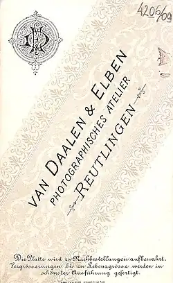 Aus welchem Grund der junge niederländische Fotograf nach Württemberg kam, ist nicht bekannt. Es konnte sich um Aussicht auf besseren Erfolg handeln. Im April 1886 eröffnete Jean van Daalen zusammen mit dem Privatier Oskar Elben ein fotografisches Geschäft in Reutlingen in der Kaiserstraße 31. Dieses Geschäft existierte bis April 1889.[3] Danach verlegte Jean van Daalen seine Tätigkeit nach Heilbronn. Der Grund dafür waren offensichtlich seine Heiratspläne, denn bereits im Juni des gleichen Jahres 1889 heiratete er dort Emilie Luise Vogt.[4] In Heilbronn war Jean van Daalen Inhaber einer „Photographischen Kunstanstalt“ und im Adressbuch bezeichnete er sich als „Maler und Photograph“. Am 8. November 1893 wurde er von Franz Josef I., dem Kaiser von Österreich, zum „Hofphotographen“ ernannt. Bald danach bekam er diesen Titel auch vom württembergischen König Wilhelm II, sowie von den beiden Fürsten von Hohenlohe: Friedrich zu Hohenlohe-Schillingsfürst und Hugo zu Hohenlohe-Öhringen. Diesen Titel wusste er dann werbewirksam zu nutzen, indem er darauf sowohl auf den Reversen seiner Arbeiten, als auch in den Zeitungsanzeigen hinwies.[5]