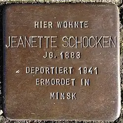 Nach den Novemberpogromen 1938 emigrierten Jeanette Schockens Kinder Heinz und Hilde in die USA, ihr Schwiegersohn Erkeles mit den Enkeln nach Palästina. Jeanette Schocken blieb mit ihrer Tochter Edith, die wegen des NS-Terrors psychisch erkrankt war, in ihrem Haus in Lehe (heute Bremerhaven). Am 17. November 1941 wurden sie zusammen mit anderen Bremer und Bremerhavener Juden nach Minsk deportiert und mutmaßlich im Vernichtungslager Maly Trostinez ermordet.