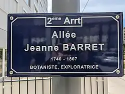 Jeanne Barret (auch Jeanne Baret; Pseudonym Jean Baré, * 27. Juli 1740 in La Comelle;[1]5. August 1807 in Saint-Aulaye (Saint-Antoine-de-Breuilh))[2] war eine französische Naturforscherin und Botanikerin. Als Mitglied der Expedition von Louis-Antoine de Bougainville zwischen 1766 und 1769 mit den Schiffen Boudeuse und Étoile war sie die erste bekannte Frau, die die Welt umsegelte. Als Mann verkleidet, begleitete sie unter dem Namen Jean Barret als Assistent den Naturforscher Philibert Commerson auf der Reise.[3]