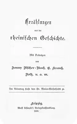 - Erzählungen aus der rheinischen Geschichte, darin drei Jenny-Bach-Beiträge. Lesimple, Leipzig, 1883.