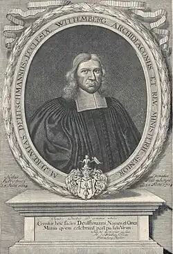 - ↑ verheiratet am 16. November 1645 in Eilenburg, Sie war die Tochter des Eilenburger Superintendenten Friedrich Leyser und schloss eine zweite Ehe mit Johann Friedrich Schwalbe.