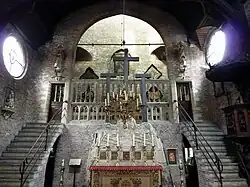 Der Innenraum der Chorturmkirche ist in zwei Geschosse geteilt. Im Zentrum des ersten Raumes im Erdgeschoss befindet sich ein Grabmal samt einem schwarzen Gisant von Anselm Adornes und seiner Gemahlin Margareta van der Banck. An beiden Seiten des steinernen Altars, hinter dem der Kalvarienberg aufragt, führen Treppen zum oberen Geschoss, wo sich ein weiterer Altar befindet. Von den Treppen kaschiert werden zwei Durchgänge zum hinteren Raum im Erdgeschoss der Jerusalemkirche, einer Art Krypta, von der man weiter zum Heiligen Grab gelangt.
