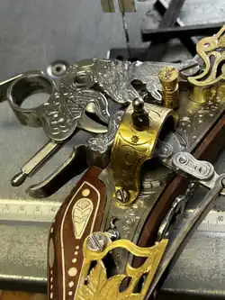 Jede Waffe, die aus den Händen von Jerzy Wałga kommt, wird unter Beibehaltung traditioneller Waffentechniken hergestellt. Jedes Teil wird von Hand gefertigt. Auch die reichhaltige Gravur und Intarsien werden von Hand ausgeführt. Die Arbeit an einem Tesching dauert zwischen 3 und 4 Monaten.[9]
