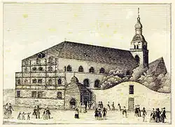 Das Klostergebäude selbst war u-förmig um einen geräumigen Innenhof angelegt, in dem sich der mit einem Springbrunnen geschmückte Klostergarten befand. Der Westflügel des Klosters verlief in Richtung Scherpstraße, wo ein Mauerzug mit einem großen Einfahrtstor das Vorgelände abschloss. Während des großen Stadtbrands im Jahr 1656 wurden die Klostergebäude und die Klosterkirche stark in Mitleidenschaft gezogen, wobei allein das Schulgebäude relativ unbeschädigt blieb. Zunächst wurde die Klosterkirche restauriert und zwischen 1658 und 1668 mit einem Turmbau ergänzt sowie zwischen 1663 und 1693 die Klosteranlage wieder vollständig neu aufgebaut. Darüber hinaus wurde 1686 das Schulprogramm durch die Zulassung als „Außenstelle“ der Universität Trier zum Erwerb eines niederen Abschlusses im Fach Philosophie, der zuvor am Dominikanerkloster Aachen absolviert werden konnte, sowie ab 1717 um die Einführung eines Theologiestudiums erweitert. Damit sicherte der Orden die Priesterausbildung und schuf auch einen Kanal für sozialen Aufstieg. Die Niederlassung unterstand der Niederrheinischen Provinz der Jesuiten mit der Leitung in Köln.[3]