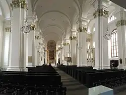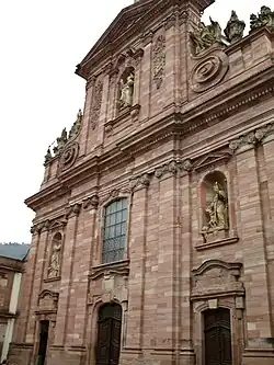 Die im Barockstil erbaute Jesuitenkirche ist eine dreischiffige Pfeilerhalle, wobei der Typ der Hallenkirche zum Zeitpunkt der Erbauung der Kirche ein vergleichsweise altmodischer Bautyp war.[4] Die Kirche ist aus heimischem Buntsandstein erbaut. Das Langhaus besteht aus fünf Jochen, der Hallenchor aus zwei Jochen. Das Eingangsjoch ist verkürzt und mit einer Empore ausgestattet. Das fünfte Joch ist länger als die übrigen und vermittelt die Illusion eines Querhauses. Die Freipfeiler mit quadratischem Kern korrespondieren mit Wandpfeilern, die ebenfalls einen quadratischen Kern haben und mit kurzen Mauerzungen an die Seitenwände angebunden sind. An den Pfeilern befinden sich kräftige Pilaster. Die Seitenschiffe sind gegen den Chor durch Wände abgeschlossen. Die Seitenschiffe sind merklich schmaler und etwas niedriger als das Langhaus. Sowohl über dem Langhaus als auch über den Seitenschiffen befinden sich Kreuzgratgewölbe.