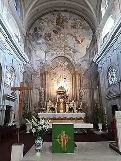 Die Jesuitenkirche ist eine Wandpfeilerkirche mit zwei Seitenkapellen in jedem Joch und darüber durchlaufenden Emporen. Den Abschluss bildet ein Stichkappengewölbe. Von der überwiegend barocken Ausstattung gilt die Maria mit dem Kind über dem Tabernakel als „bedeutendste Barockmalerei Hermannstadts“.[3] An der Südwand des Chores steht das monumentale Grabdenkmal des Feldmarschalls Otto Ferdinand von Abensperg und Traun (1677–1748), ein Werk des Bildhauers Anton Schuchbauer.[4] Die Bildfenster mit biblischen, hagiografischen und allegorischen Motiven wurden 1901 in Budapest angefertigt.