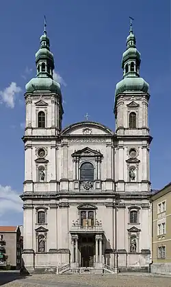 Die dreiachsige Westfassade ist mit Pilastern gegliedert. Die dreigeschossigen Türme sind mit barocken Helmen ausgestattet, in den von Muscheln gekrönten Nischen stehen Skulpturen. Eine Besonderheit stellt die Eingangspartie dar: zwei seitlich angeordnete Treppen führen zum Podest, darüber befindet sich ein Balkon, von zwei korinthischen Säulenpaaren getragen, die Brüstung mit Balustern und zwei Pinakelpaaren geschmückt.