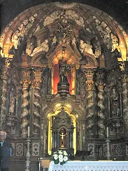 - Der Hochaltar beruht auf einem Entwurf von Ignacio Íbero und wurde zwischen 1740 und 1757 in churriguereskem Stil errichtet.[15] Zwei Paare „Salomonischer Säulen“ flankieren den Altar. Die Dekoration der Predella, auch aus Marmor, enthält militärische Symbolik und Anspielungen auf die Heiligen Herzen Jesu und Marias. Hier befindet sich auch das Tabernakel und eine silberne Statue des Heiligen Ignatius. Die Statue wurde in Erfüllung eines Gelübdes der Real Compañía Guipuzcoana de Caracas gestiftet, 1741 vom Valencianer Francisco de Vergara in Rom entworfen und von dem deutschen Silberschmied Joseph Bauer[Anm. 4] in Silber ausgeführt. Die Figur wurde 1758 auf dem Altar aufgestellt.[16] Der Altar wird durch Bilder des Heiligen Josef und des Heiligen Joachim ergänzt. Um den Hauptaltar an die liturgischen Normen des Zweiten Vatikanischen Konzils anzupassen, wurde die Basilika mit einem weiteren Altar ausgestattet, der sich vor dem Hauptaltar befindet.