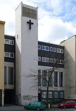 Der Baukörper, ein Stahlbeton-Skelettbau, ist von der Baulinie zurückgesetzt und hat einen rechteckigen, quer zur Straße liegenden Grundriss. Das Schiff der Saalkirche liegt im zweiten Obergeschoss des Gebäudes. Darüber befinden sich zwei Wohngeschosse, die zur Straße Fenster und zum Hof Loggien haben, darunter ist der Jugendraum. Die Rahmen und Balken des Tragwerks im Bereich der Fassade des Kirchenschiffs mit kleinen weißen Keramikfliesen verkleidet. Die übrigen Wandflächen zwischen den Fenstern sind dunkel verputzt.