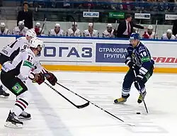 Korotkow (im Trikot von Amur, rechts) und Dmitri Rjabykin (li.), Martin Škoula (li., verdeckt)