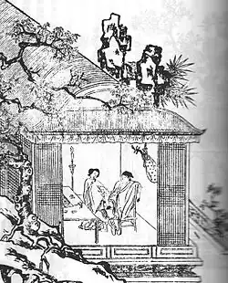 Das Werk ist eng mit einer Reihe von Holzschnittgrafiken verknüpft, die verschiedene Szenen darstellen. Erstmals erschienen diese in der Zeit zwischen 1628 und 1644. Sie lassen sich mindestens fünf verschiedenen Meistern zuordnen, darunter Huang Jianzhong (黃建中 / 黄建中), einem Mitarbeiter von Chen Hongshou. Die Abbildungen spiegeln in ihren Details, u. a. der Kleidung, die Ming- (1368–1644) und nicht die Song-Dynastie (960–1279) wider, in der die Handlung angesiedelt ist.[2] Diese Rückdatierung kann als Kunstgriff verstanden werden, mit dem die damalige Zensur umgangen werden sollte.