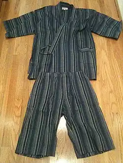 Jinbei ist eine traditionelle japanische Kleidung aus Hanf oder Baumwolle, die ursprünglich nur zu Hause oder zum Schlafen getragen wurde. Sie wird aber auch zunehmend im Sommer auf traditionellen Festumzügen getragen, als Ersatz für einen einteiligen Yukata. Jinbei bestehen aus einer kurzen Hose und einer Jacke mit kurzen Ärmeln, die an der Körperseite mit zwei Knoten festgebunden wird.[1] Ein ähnliches Kleidungsstück ist der Samue, der jedoch aus einer langen Hose und einer langärmligen Jacke besteht.[2][3]