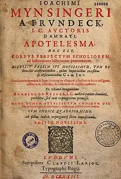 - Ioachimi Mynsingeri A'Frundeck ... Singularium observationum iudicii imperialis camerae (uti vocant) Centuria quatuor, ... - Basileae : Episcopius, 1563.