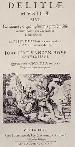- ↑ Vgl. etwa Helmut Mönkemeyer (Hrsg.): Joachim van den Hove: Delitiae musicae, 1612 Teil I–IV (= Die Tabulatur. Ausgewählte Werke in ihrer Originalnotation mit Übertragungen für Laute (oder ein Tasteninstrument) und Gitarre. Heft 13–16). Friedrich Hofmeister, Hofheim Taunus.