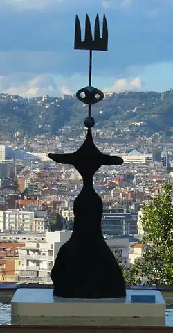Nach der Besetzung Frankreichs durch die deutschen Truppen während des Zweiten Weltkriegs im Jahr 1940 kehrte Joan Miró von seinem Zufluchtsort Varengeville-sur-Mer, wo er die Sommermonate seit 1938 verbracht hatte,[15] in sein Heimatland Spanien zurück und wohnte zunächst in Palma de Mallorca, ab 1942 in Barcelona in seinem Geburtshaus. Im Jahr des Todes seiner Mutter 1944 begann er zusammen mit seinem Freund, dem katalanischen Keramiker Josep Llorens i Artigas, den er aus Barcelona kannte, mit Keramikarbeiten. Artigas, der ebenfalls zusammen mit Raoul Dufy und Albert Marquet arbeitete, hatte Miró zur Keramik geführt.[16] Zudem schuf er erste modellierte Figuren kleineren Formats, die 1950 in Bronze gegossen wurden.[17]