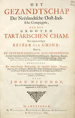 Nieuhofs China-Buch „Het Gezandtschap der Neêrlandtsche Oost-Indische Compagnie, aan den grooten Tartarischen Cham, den tegenwoordigen Keizer van China“ (deutsch: „Die Gesandtschaft der Niederländischen Ostindienkompanie an den großen Tartarischen Khan, den gegenwärtigen Kaiser von China“) war ein Bestseller, obwohl es aufgrund der zahlreichen Kupferstiche ziemlich teuer war. Wie enthusiastisch das Buch von der europäischen Leserschaft aufgenommen wurde, verdeutlichen die vielen Auflagen – fünf niederländische (1665, 1669, 1670, 1680 und 1693), drei deutsche (1666, 1669 und 1675), zwei englische (1669 und 1673), eine französische (1665) und eine lateinische (1668), sowie eine weitere niederländische (1666).
