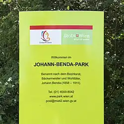 Der Park und der Teich wurden am 8. Oktober 1987 im Gemeinderatsausschuss für Kultur der Stadt Wien nach dem Bezirksrat und Bäckermeister Johann Benda (1858–1911) benannt.[3][4]