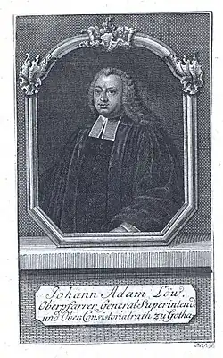 - Johann Adam Löw wurde 1735 Mitglied der Deutschen Gesellschaft in Leipzig und im gleichen Jahr Mitglied der dortigen von Gottsched gegründeten Nachmittägigen Rednergesellschaft[5].