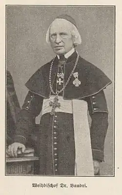 Der Erzbischof hätte ihn gerne als Dompropst an der Spitze des Domkapitels gesehen, doch widersetzte sich der König von Preußen, dem die Besetzung der Propstei zustand, diesem Wunsch. Stattdessen erhielt er 1853 das Domdekanat, die zweite Dignität des Kapitels, deren Nomination dem Erzbischof zustand. Geissel ließ ihn 1848 als Berater an der Würzburger Bischofskonferenz teilnehmen, wo dieser über das staatliche Plazet referierte. Seit 1849 Dr. theol. h. c. der Universität Bonn, wurde er zudem 1862 Präsident des Vereins vom Heiligen Grab. Im gleichen Jahr als Vertreter des Erzbischofs zum Ad-limina-Besuch nach Rom entsandt, wo er bereits seit 1857 die Würde eines päpstlichen Thronassistenten bekleidete, wollte ihn der Erzbischof möglicherweise als seinen Nachfolger empfehlen – Gerüchte, die bereits 1856 und 1863 in Umlauf waren. Faktisch stand er 1856 in Paderborn, 1864 in Köln und Trier, wie auch 1868 in Freiburg zur Wahl, wurde jedoch jedes Mal von den Landesregierungen abgelehnt, da er als Ultramontaner und Staatsgegner galt. In Köln versuchte eine ansehnliche Minderheit, seine Wahl zu vereiteln, was ihr ja auch gelang, doch konnte er am 13. September 1864 mit sieben von zwölf Stimmen zum Kapitularvikar gewählt werden. Mit dem Ausbruch des Kulturkampfes wurde am 28. Juni 1876 das Generalvikariat geschlossen, welches Baudri bis zu diesem Zeitpunkt immer noch innehatte. In den folgenden Jahren fungierte Baudri auch weiterhin als Weihbischof, aber nicht mehr als Generalvikar. Alter und Krankheit zwangen ihn, dieses Amt 1889 aufzugeben, in dem ihm Antonius Fischer, der nachmalige Erzbischof, folgte.