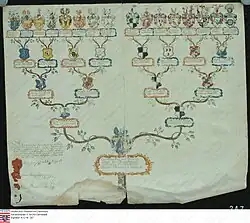 - im Hessischen Staatsarchiv Darmstadt unter dem Titel Ahnenprobe des Carl Georg Hermann und Johann Carl Löw v. u. z. Steinfurth. - ausgefertigt 1770 Mai 14, Pergament, Sachakte aus der Provenienz von Burg Friedberg, vielfarbig mit Stammbäumen illustrierte Urkunde aus dem Jahr 1770, Archivsignatur HStAD, A 12, 247 (alte Archivsignatur 69)[7]