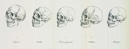 In seiner Dissertation De generis humanis varietate nativa untersuchte Blumenbach 1775 die anatomischen und morphologischen Varietäten des Menschen. Er kam zu dem Ergebnis, dass diese Varietäten erstens nur äußerlicher Natur und für die intellektuellen Fähigkeiten der Menschen bedeutungslos sind und dass sie zweitens ein kontinuierliches Spektrum darstellen, sodass es nicht möglich sei, feste Grenzen zwischen verschiedenen menschlichen Populationen zu ziehen.[17] Im Gegensatz zu der bald an Popularität gewinnenden Ansicht, dass jede „Rasse“ separat entstanden sei, nahm er deshalb einen einheitlichen Ursprung der Menschheit aus einer „Gattung“ an. Im Anschluss an Carl von Linné und zeitgleich mit Immanuel Kants Schrift Von den verschiedenen Racen der Menschen beschrieb er – im Sinne einer wissenschaftlichen Systematik, nicht als Abbildung einer physischen Realität – vier morphologische Varietäten des Menschen, wobei er sich u. a. auf seine bei seinem Tod etwa 240 Stücke umfassende Schädelsammlung stützte.[18]